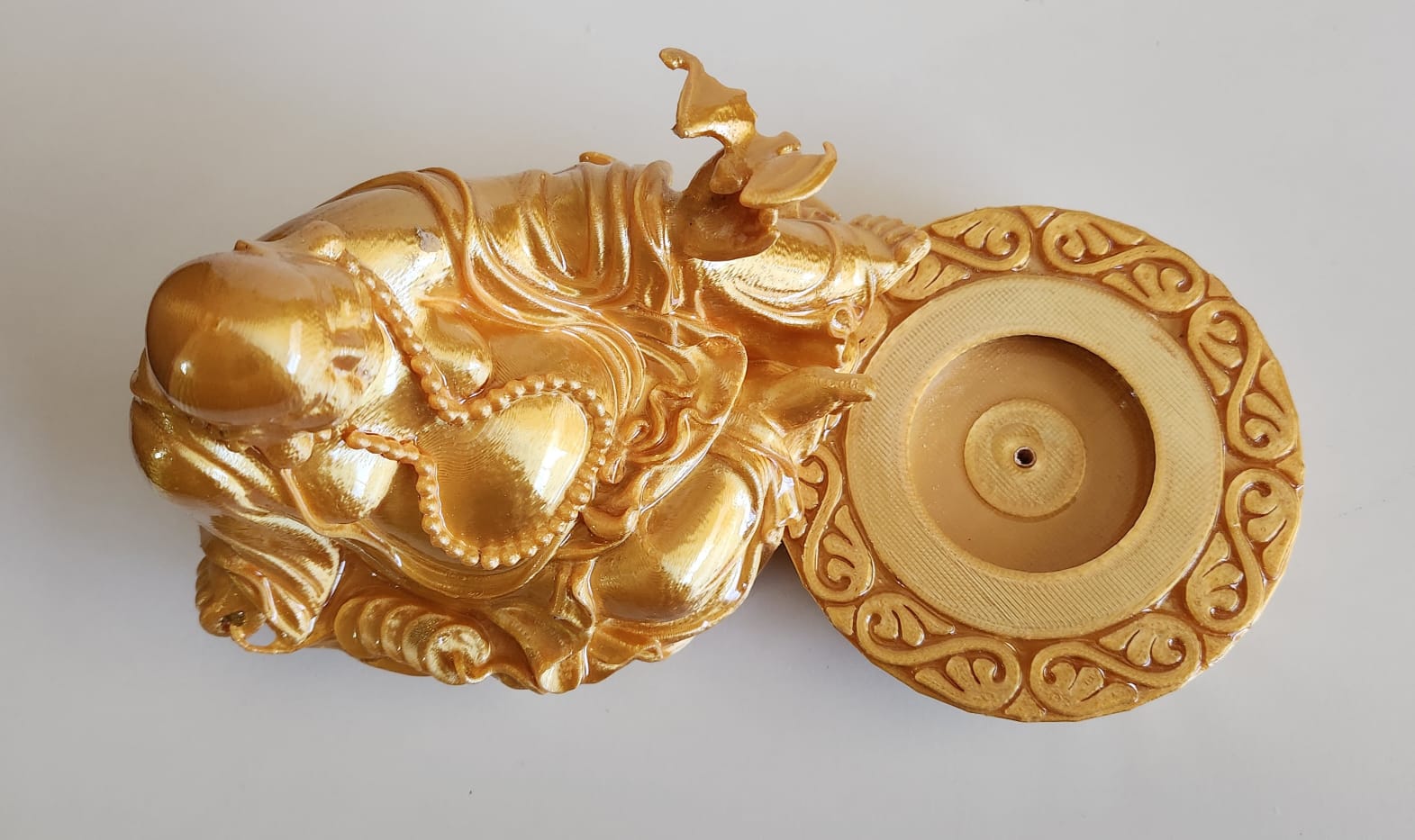 Elevate your spiritual practice with our exquisite Buddha Incense Holder. This handcrafted masterpiece, 3D printed in a stunning gold silk PLA, captures the serene beauty and wisdom of the Buddha. Coated with clear resin, the statue boasts a lustrous finish that adds to its timeless appeal.
