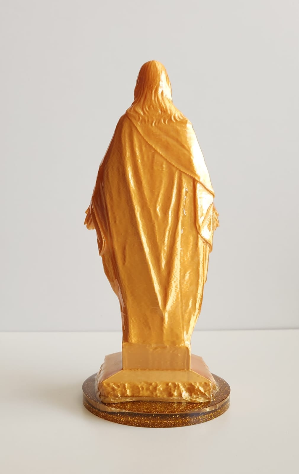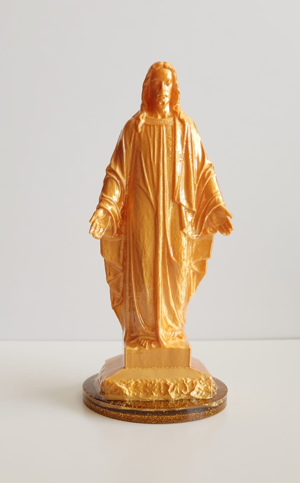 Meticulously detailed and coated in a clear resin for a lustrous finish, this statue captures the serene majesty of Jesus Christ. The use of Gold Silk PLA adds a touch of divine radiance, making it a captivating centerpiece for any space.